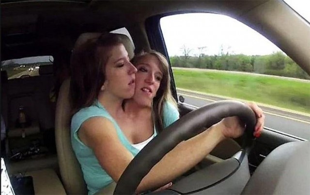 Yapışık olan bu ikizler arabayı kolaylıkla kullanabiliyor. Bir tanesi sağ kolu kontrol ederken diğeri sol kolu kontrol ediyor.