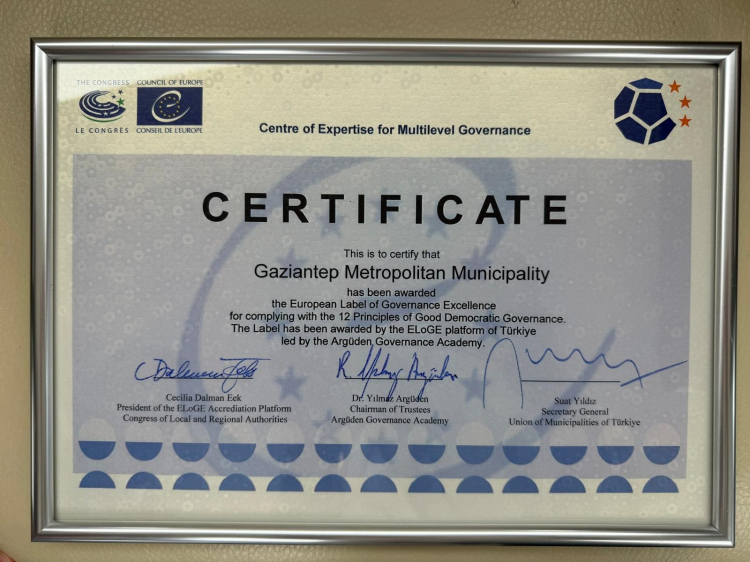 Gaziantep Büyükşehir Belediyesi'nin kenti yönetirken esas aldığı; şeffaflık, katılımcılık, hesap verebilirlik, etkinlik, hukukun üstünlüğü ve insan haklarına saygı gibi 12 iyi yönetişim ilkesi, Avrupa Yönetişim Mükemmelliği Markası (ELoGE) ödülünü beraberinde getirdi.