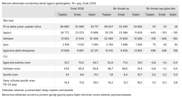 Ocak ayında istihdam edilenlerin sayısı 516 bin kişi azalarak 31 milyon 953 bin kişi oldu; istihdam oranı da 0,8 puan düşerek yüzde 47,9 seviyesine geriledi. Erkeklerde istihdam oranı yüzde 65,3, kadınlarda ise yüzde 30,9 olarak gerçekleşti. Mevsim etkisinden arındırılmış işgücüne katılma oranı ise 0,8 puan azalarak yüzde 52,1 seviyesinde kaydedildi. Toplam işgücü Ocak ayında bir önceki aya göre 443 bin kişi azalarak 34 milyon 772 bin kişi oldu. İşgücüne katılma oranı erkeklerde yüzde 70,0, kadınlarda yüzde 34,7 olarak gerçekleşti.