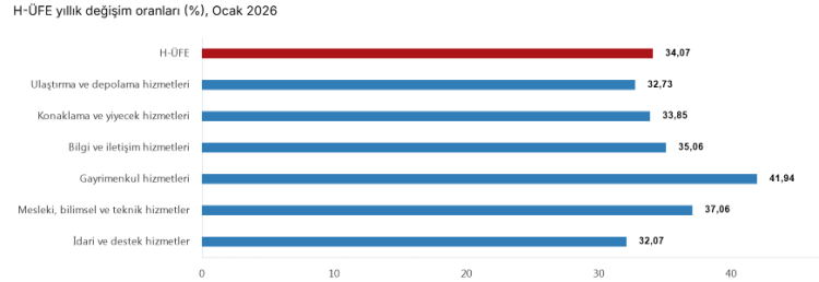 ANKARA (İGFA) - Türkiye İstatistik Kurumu (TÜİK), 2026 yılı Ocak ayına ilişkin Hizmet Üretici Fiyat Endeksi (H-ÜFE) verilerini açıkladı. Buna göre endeks, bir önceki aya göre yüzde 7,74, bir önceki yılın Aralık ayına göre yüzde 7,74, geçen yılın aynı ayına göre ise yüzde 34,07 arttı. 12 aylık ortalamalara göre artış oranı yüzde 36,27 olarak gerçekleşti.