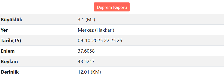 Deprem, 9 Ekim 2025 saat 22.25’te meydana geldi. Yerin yaklaşık 12 kilometre derinliğinde gerçekleşen sarsıntının merkez üssü Hakkari olarak açıklandı.