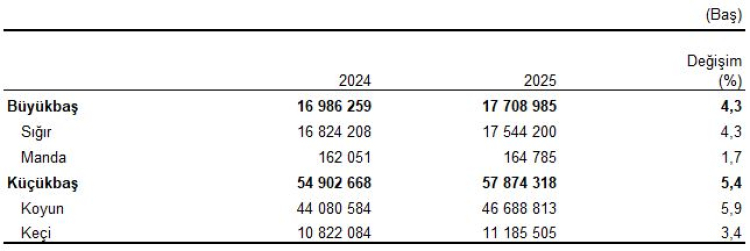 Büyükbaş hayvan kategorisinde, sığır sayısı bir önceki yıla göre yüzde 4,3 artarak 17 milyon 544 bin başa, manda sayısı ise yüzde 1,7 artışla 164 bin 785 başa ulaştı.
