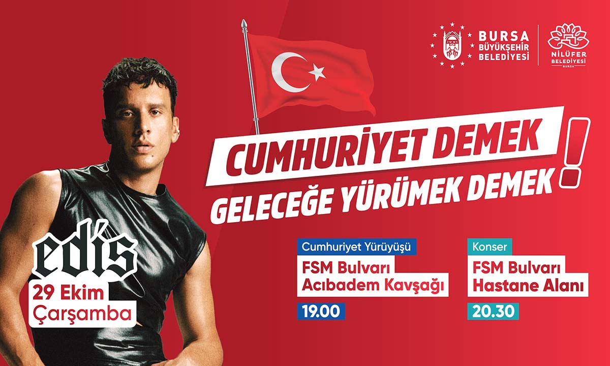 29 Ekim Cumhuriyet Bayramı etkinlikleri kapsamında Büyükşehir Belediyesi ve Nilüfer Belediyesi iş birliğiyle Fatih Sultan Mehmet Bulvarı’nda yapılacak olan ‘Cumhuriyet Yürüyüşü’ ile coşku doruğa çıkacak. Saat 19.00’da bir araya gelecek olan Cumhuriyet sevdalıları, ellerinde Türk Bayrakları ve Ata posterleriyle hep bir ağızdan şarkılar ve marşlar söyleyerek Cumhuriyet’i doyasıya yaşayacak. Saat 20.30’da Nilüfer Hastane Alanı'ndaki Edis konseriyle de Cumhuriyet Bayramı coşkusu perçinlenecek. Sevilen şarkılarını Bursalılar için seslendirecek olan Edis, muhteşem sahne şovuyla da vatandaşlara unutulmaz bir gece yaşatacak.