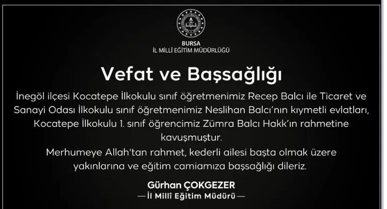 Bursa İl Milli Eğitim Müdürlüğü de yayımladığı mesajla acı haberi duyurdu. Yapılan açıklamada, Kocatepe İlkokulu sınıf öğretmeni Recep Balcı ile Ticaret ve Sanayi Odası İlkokulu sınıf öğretmeni Neslihan Balcı’nın kızları olan Kocatepe İlkokulu 1. sınıf öğrencisi Zümra Balcı’nın hayatını kaybettiği belirtildi. Ayrıca açıklamada merhumeye Allah’tan rahmet, ailesine ve yakınlarına sabır temennisinde bulunuldu.
