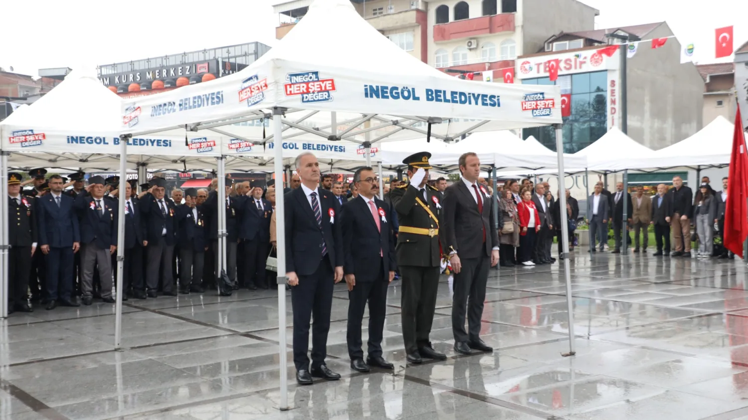 Çelenk törenine; Kaymakam Eren Arslan, Belediye Başkanı Alper Taban, ilçe protokolü, siyasi partiler, sivil toplum kuruluşları temsilcileri, öğrenciler ve vatandaşlar katıldı. Çelenk sunumuyla başlayan 29 Ekim Cumhuriyet Bayramı töreninde sırasıyla; Kaymakamlık, Garnizon Komutanlığı ve İnegöl Belediye Başkanlığı çelenkleri anıta bırakıldı. Daha sonra saygı duruşunda bulunularak İstiklal Marşı okundu. Törenin burada sona erdi.