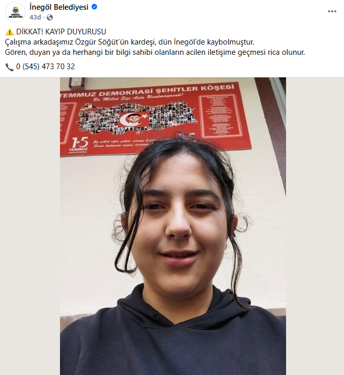 Çalışma arkadaşımız Özgür Söğüt’ün kardeşi, dün İnegöl’de kaybolmuştur.