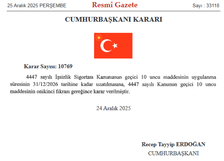 Bugünkü Resmi Gazete'de yayımlanan Cumhurbaşkanı Kararı ile 4447 sayılı İşsizlik Sigortası Kanunu'nun Geçici 10 uncu Maddesi'nin uygulanma süresi uzatıldı.