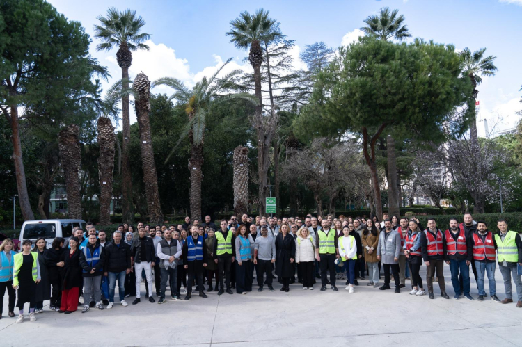 İzmir Büyükşehir Belediyesi Afet İşleri ve Risk Yönetimi Dairesi Başkanlığı öncülüğünde, kurum çalışanlarının deprem, yangın ve benzeri acil durumlarda doğru davranış geliştirmesini sağlamak amacıyla kapsamlı bir afet ve acil durum tatbikatı gerçekleştiriliyor.