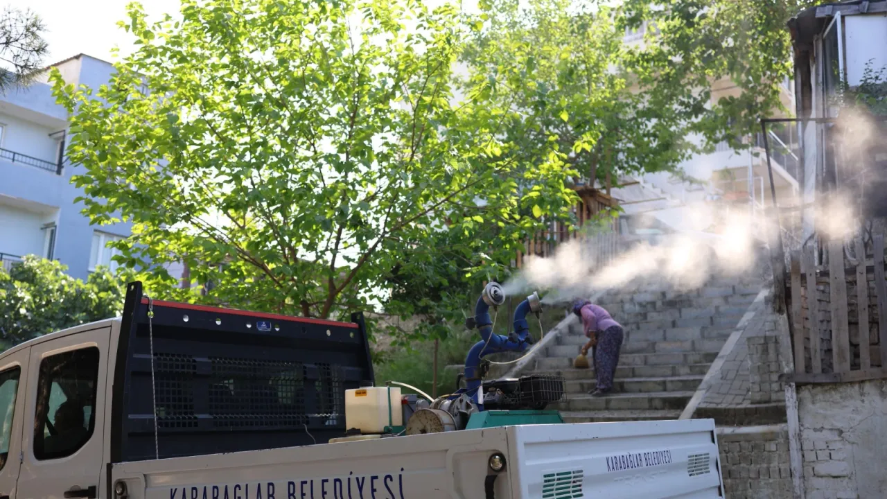 İzmir Karabağlar Belediyesi, kış aylarında periyodik olarak yürüttüğü ilaçlama çalışmalarına yaz aylarında da devam ediyor.İZMİR (İGFA) - Özellikle sıcak havalarda artış gösteren sinek ve haşere sorununa karşı başlatılan ilaçlama programı aralıksız şekilde sürüyor. Belediye ekipleri, sabahın erken saatlerinden gece geç saatlere kadar mahalle mahalle ilaçlama çalışmaları gerçekleştiriyor. İlaçlama programı ise sosyal medya hesaplarından gün gün ve saat saat paylaşarak vatandaşların bilgilendirilmesi sağlanıyor.