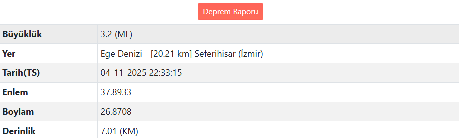Türkiye beşik gibi sallanıyor. Ege Denizi’nde, İzmir’in Seferihisar ilçesi açıklarında saat 22.33’te deprem meydana geldi. AFAD verilerine göre, depremin büyüklüğü 3.2 (ML), derinliği ise 7.01 kilometre olarak ölçüldü.