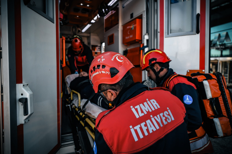 İzmir Büyükşehir Belediyesi İtfaiye ekipleri, Bayraklı'daki 47 katlı binada olası yangın ve acil durumlara karşı gerçeği aratmayan bir tatbikat gerçekleştirdi.