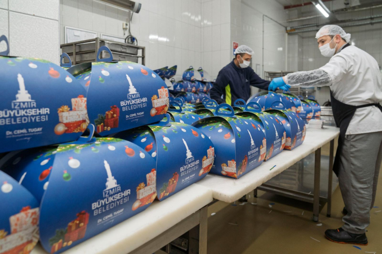 Büyükşehir Belediyesi'nin Sosyal Yardım Takip Sistemi'nde kayıtlı haneler için İzmir Büyükşehir Belediyesi Sosyal Yaşam Kampüsü içinde hizmet veren Aşevi'nde 3 bin 20 pasta yapıldı. Dağıtıma başlanan pastaların kutuları içinde İzmir Büyükşehir Belediye Başkanı Dr. Cemil Tugay'ın yeni yıl mesajı da yer aldı.