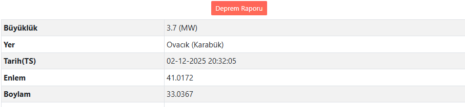 Karabük’ün Ovacık ilçesinde 3,7 büyüklüğünde deprem meydana geldi. Deprem, 2 Aralık 2025 tarihinde saat 20.32’de kaydedildi.