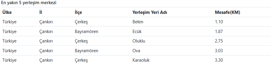 Depreme en yakın yerleşim yerleri arasında Çankırı’nın Çerkeş ilçesine bağlı Belen köyünün 1,10 kilometre, Bayramören ilçesine bağlı Ecük’ün 1,87 kilometre, Çerkeş’e bağlı Oluklu’nun 2,75 kilometre, Bayramören’e bağlı Ova’nın 3,03 kilometre ve Çerkeş’e bağlı Karaoluk’un 3,30 kilometre mesafede bulunduğu bilgisi paylaşıldı.