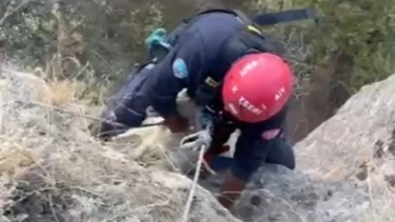 Kayseri Büyükşehir Belediyesi İtfaiye Daire Başkanlığı ekipleri, Talas ilçesi viyadük bölgesinde uçuruma düşen bir keçiyi kısa sürede gerçekleştirilen titiz bir operasyonla kurtardı.