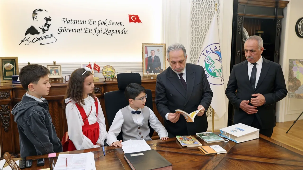Kayseri Talas Belediye Başkanı Mustafa Yalçın, 23 Nisan Ulusal Egemenlik ve Çocuk Bayramı kapsamında Cemil Baba İlkokulu 4. sınıf öğrencileri Umut Mert Kahraman, Muhammed Ömer Yüksel ve Merve Nisa Özdemir'i makamında ağırladı. Ziyarete İlçe Milli Eğitim Şube Müdürü Ahmet Çakır, Okul Müdürü Sami Aydın ile öğretmenler de eşlik etti.