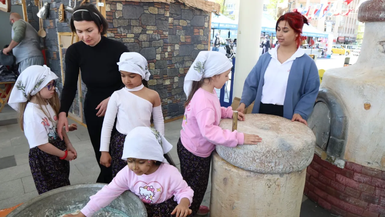 KOCAELİ (İGFA) - Kocaeli Büyükşehir Belediyesi'nin İzmit Milli İrade Meydanı'nda gerçekleştirdiği 23 Nisan Şenliği'nin dikkat çeken noktalarından biri olan 'Somuncuklar Etkinlik Alanı', köy hayatını yansıtan atmosferiyle çocukları geleneksel üretim süreçleriyle buluşturuyor. Minikler bu alanda, ekmeğin sofralara ulaşana kadar geçtiği tüm aşamaları uygulamalı olarak öğreniyor. Hamurun yoğrulmasından dinlendirilmesine, şekil verilmesinden odun fırınında pişirilmesine kadar uzanan süreç, çocuklar için hem öğretici hem de keyifli bir deneyime dönüşüyor.