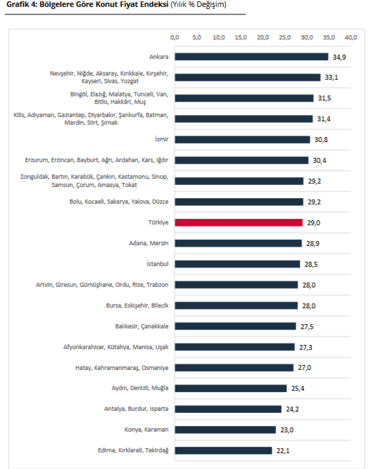 Yıllık bazda ise konut fiyatları artışını sürdürdü. Endeks değerleri bir önceki yılın aynı ayına göre İstanbul'da yüzde 28,5, Ankara'da yüzde 34,9 ve İzmir'de yüzde 30,8 oranında yükseldi.