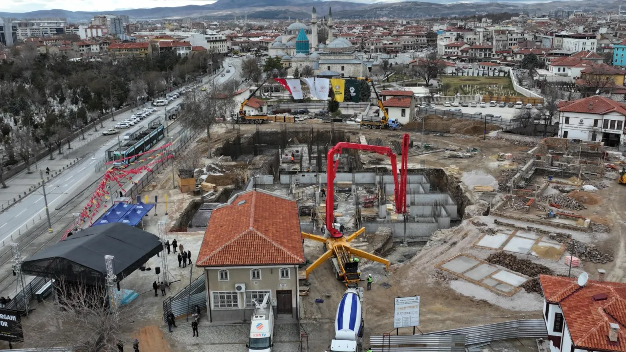 KONYA (İGFA) - Konya Büyükşehir Belediyesi'nin Karatay Belediyesi ile birlikte yürüttüğü 'Mevlana Türbesi Arkası Kentsel Yenileme Projesi' kapsamında inşa edilecek Mevlevi Dergâhı'nın temeli, Mevlana Türbesi arkasında düzenlenen törenle atıldı. Proje, Konya'nın tarihi kimliğini güçlendirmeyi ve bölgeyi kültür-turizm açısından yeniden canlandırmayı hedefliyor.
