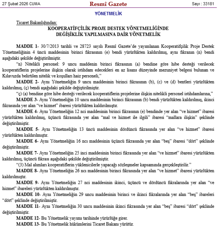 Ticaret Bakanlığı'nın Kooperatifçilik Proje Destek Yönetmeliği'nde yaptığı değişiklikler Resmi Gazete'de yayımlanarak yürürlüğe girdi. Düzenlemeyle 'hizmet' ibareleri birçok maddeden çıkarılırken, nitelikli personel istihdamına ilişkin hükümler yeniden düzenlendi ve bazı süreler 5 yıldan 4 yıla indirildi.