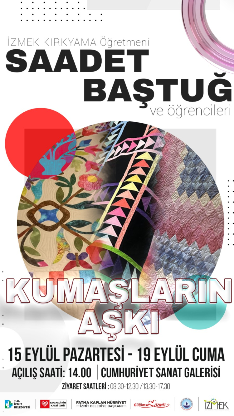İZMEK Öğretmenlerinden Saadet Baştuğ’un öğrencileriyle birlikte hazırladığı ‘Kumaşların Aşkı ‘sergisi, 15 Eylül Pazartesi günü Cumhuriyet Sanat Galerisi’nde açılıyorKOCAELİ (İGFA) - Kocaeli İzmit Belediyesi sanat buluşmalarına devam ediyor. Bu kapsamda Cumhuriyet Sanat Galerisi’nde, Kırkyama sanatı ‘Kumaşların Aşkı ‘sergisinde vatandaşlarla buluşacak. İZMEK Öğretmenlerinden Saadet Baştuğ’un öğrencileriyle birlikte hazırladığı 41 eserle açılacak olan sergi, 15 Eylül Pazartesi günü 14.00’de açılacak.
