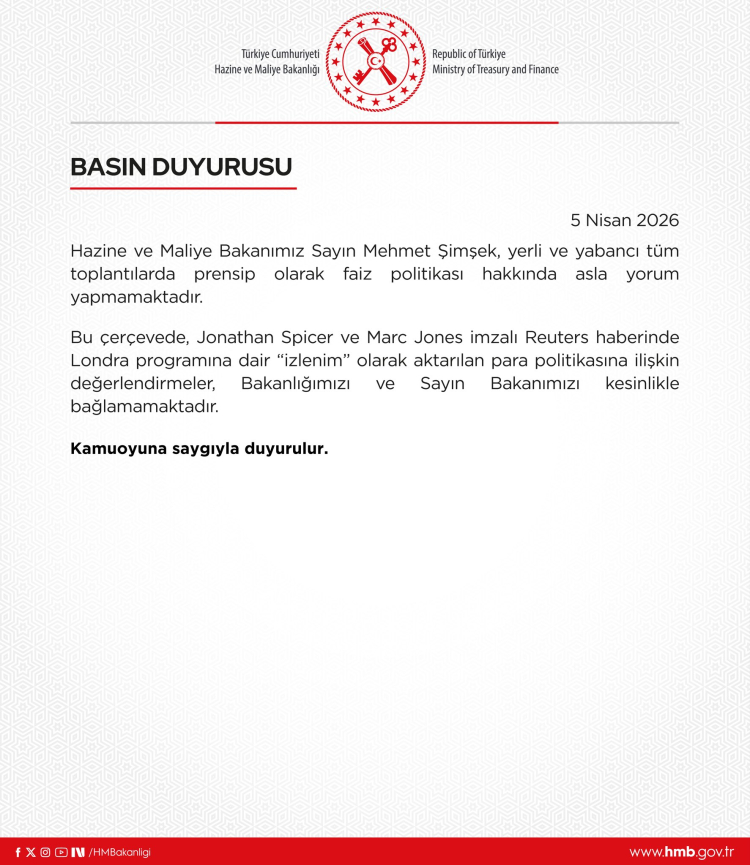 Açıklamada, Bakan Şimşek'in yerli ve yabancı yatırımcılarla gerçekleştirilen tüm toplantılarda prensip olarak faiz politikası hakkında yorum yapmadığı vurgulanırken, söz konusu değerlendirmelerin, Reuters muhabirleri Jonathan Spicer ve Marc Jones imzasıyla yayımlanan haberde 'izlenim' olarak aktarıldığına dikkat çekilerek, bu tür yorumların resmi görüş olarak kabul edilemeyeceği ifade edildi.