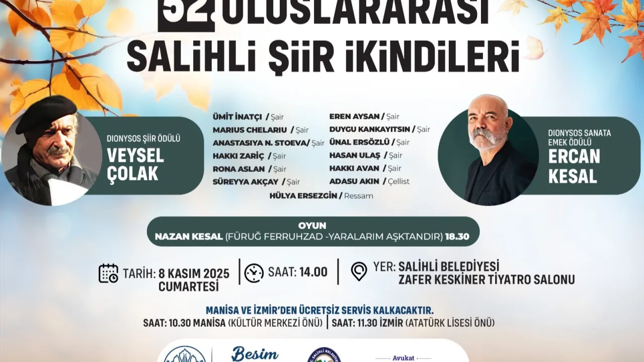 8 Kasım 2025 Cumartesi günü saat 14.00'te Salihli Belediyesi Zafer Keskiner Tiyatro Salonu'nda gerçekleştirilecek olan etkinlik için aynı gün saat 18.30'da Nazan Kesal'ın 'Füruğ Ferruhzad - Yaralarım Aşktandır' adlı sahne gösterisi sanatseverlerle buluşacak. Salihli Şiir İkindileri etkinliğine katılım için Manisa ve İzmir'den ücretsiz servis imkânı sağlanacak. Manisa'dan Kültür Merkezi önünden saat 10.30'da hareket edecek olan servis, İzmir'den ise Atatürk Lisesi önünden saat 11.30'da hareket edecek.