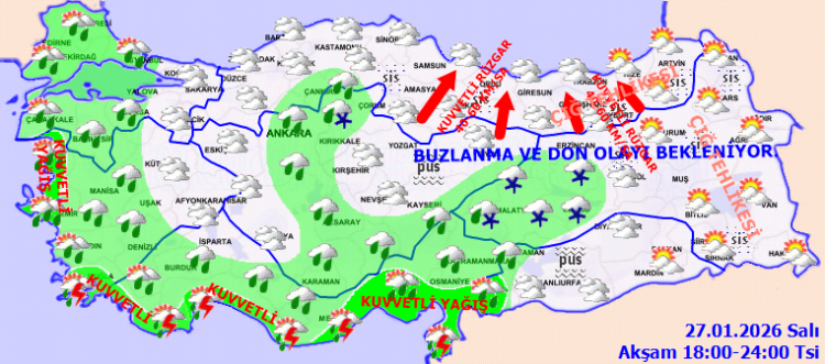 ANKARA (İGFA) - Marmara, Ege, Akdeniz, İç Anadolu ve Güneydoğu Anadolu ile Batı Karadeniz'in batı, Doğu Anadolu'nun güney ve batı kesimlerinin yağışlı geçeceği, genellikle yağmur ve sağanak, yurdun doğu kesimlerinde karla karışık yağmur ve kar şeklinde görülecek yağışların, Ege ve Akdeniz kıyıları, Güneydoğu Anadolu ve Doğu Anadolu'nun güney ve batısında yer yer kuvvetli olacağı tahmin ediliyor. Doğu Karadeniz'in iç kesimlerinin yüksekleri ile Doğu Anadolu'nun doğusunun yüksek kar örtüsüne sahip eğimli kesimlerinde çığ tehlikesi bulunmaktadır.
