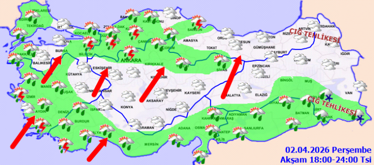 Buna göre, yağışların; Akdeniz, Batı Karadeniz (Sinop hariç), Sakarya, Ankara, Kırıkkale, Çankırı, Adıyaman, Gaziantep ve Kilis çevreleri, Şanlıurfa'nın batı ilçeleri ile gece saatlerinde itibaren İzmir ve Aydın kıyıları ile Muğla çevrelerinde yerel kuvvetli olması tahmin ediliyor. Rüzgarın; Marmara'nın Kuzeyli, Ege, Akdeniz, İç Anadolu ve Orta Karadeniz'de güneyli yönlerden kuvvetli (40-60 km/saat), Kıyı Ege'de yer yer fırtına (60- 80 km / saat) şeklinde esmesi bekleniyor. Batı Akdeniz'in batı kıyıları ile Ege kıyılarında toz taşınımı tahmin ediliyor. Batı Akdeniz'in batı kıyıları ile Ege kıyılarında toz taşınımı bekleniyor. Doğu Karadeniz'in iç kesimleri ile Doğu Anadolu'da yüksek kar örtüsüne sahip eğimli alanlarda çığ ve kar erimesi tehlikesi bulunmaktadır.