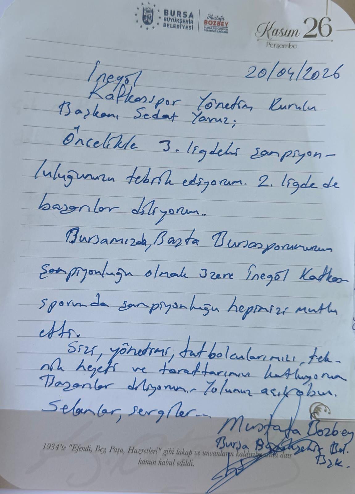 İnegöl Kafkasspor’un elde ettiği şampiyonluk, kentte büyük sevinç yaşatırken, Mustafa Bozbey’den de tebrik mesajı geldi. Bozbey, kulüp yönetimine hitaben kaleme aldığı el yazılı notta, başarıdan duyduğu memnuniyeti dile getirdi.