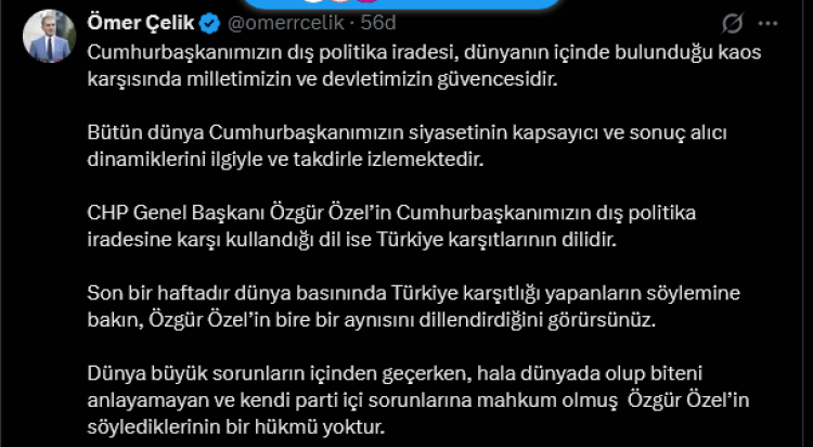 Özel'in dilini 'Türkiye karşıtlarının dili' olarak nitelendirerek, söylemlerinin dünya basınında Türkiye karşıtı söylemlerle örtüştüğünü belirten Çelik, 'Cumhurbaşkanımızın dış politika iradesi, dünyanın içinde bulunduğu kaos karşısında milletimizin ve devletimizin güvencesidir. Bütün dünya Cumhurbaşkanımızın siyasetinin kapsayıcı ve sonuç alıcı dinamiklerini ilgiyle ve takdirle izlemektedir' ifadelerini kullandı.