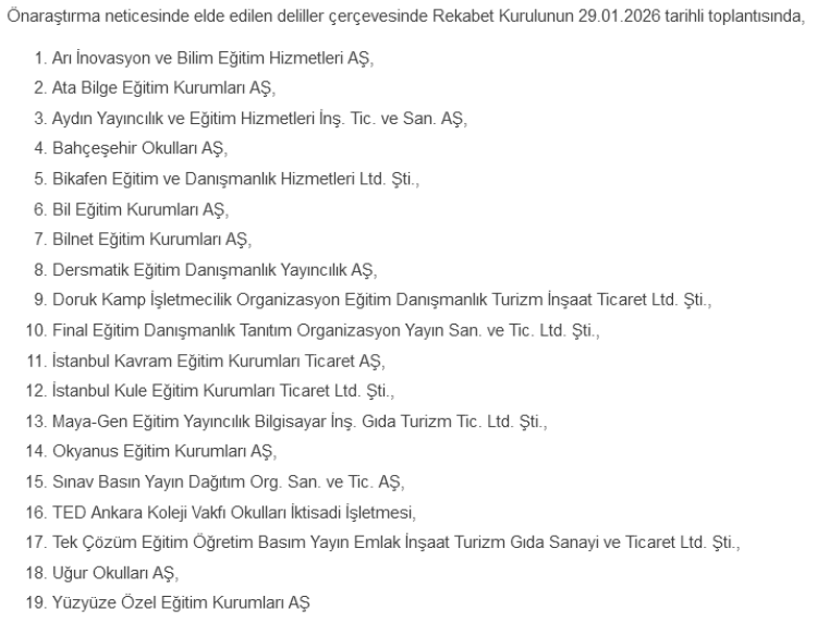 Elde edilen bulgular çerçevesinde Rekabet Kurulu'nun 29 Ocak 2026 tarihli toplantısında 19 teşebbüs hakkında 4054 sayılı Rekabetin Korunması Hakkında Kanun'un 4. maddesi kapsamında soruşturma açılmasına 26-03/73-M sayılı kararla hükmedildi. Soruşturma açılan kurumlar arasında Bahçeşehir Okulları AŞ, Bil Eğitim Kurumları AŞ, Bilnet Eğitim Kurumları AŞ, Okyanus Eğitim Kurumları AŞ, Uğur Okulları AŞ ve TED Ankara Koleji Vakfı Okulları İktisadi İşletmesi'nin de bulunduğu bildirildi.