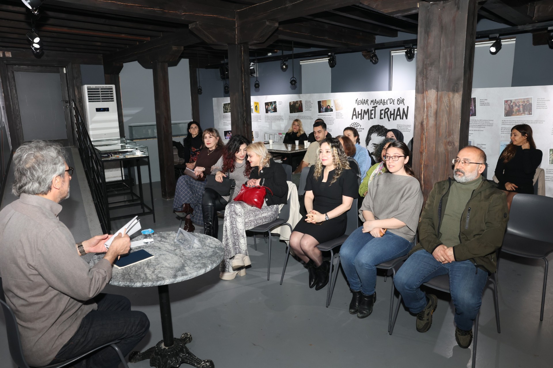 Bursa’da yaşayan yazar, şair ve edebiyatseverlerin ilgi gösterdiği serginin açılışında C. Hakkı Zariç de bir söyleşi gerçekleştirdi. Zariç, Ahmet Erhan’ın Ankara ile özdeşleşmiş bir şair olarak bilinmesine rağmen, köken ve kimlik olarak aslında tam bir Akdenizli olduğunu vurguladı. Erhan’ın şiirlerindeki Akdeniz lirizmine dikkat çeken Zariç, şairin “Alacakaranlıktaki Ülke” kitabıyla başlayan ve 12 Eylül döneminin zorlu koşullarında filizlenen edebiyat serüvenini katılımcılarla paylaştı.