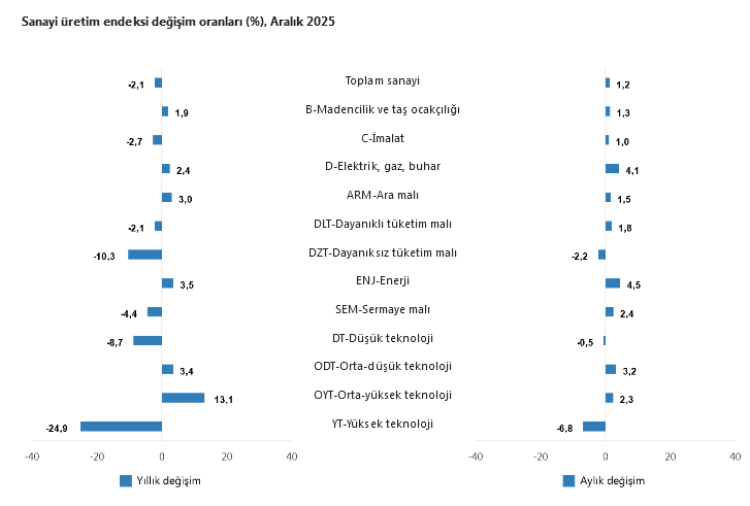TÜİK'in Sanayi Üretim Endeksi sonuçlarına göre, 2025 yılı Aralık ayında sanayi üretimi bir önceki aya göre yüzde 1,2 oranında arttı.