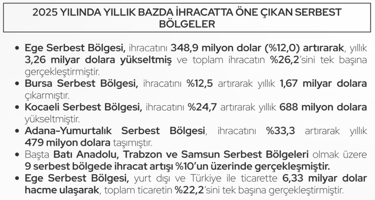 İhracatta öne çıkan serbest bölgeler arasında Ege Serbest Bölgesi, 3,26 milyar dolarlık ihracatla ilk sırada yer aldı. Bölge, toplam ihracatın yüzde 26,2'sini tek başına gerçekleştirdi. Bursa Serbest Bölgesi 1,67 milyar dolar, Kocaeli Serbest Bölgesi 688 milyon dolar ve Adana-Yumurtalık Serbest Bölgesi ise 479 milyon dolarlık ihracata ulaştı. Dokuz serbest bölgede ihracat artışı yüzde 10'un üzerinde gerçekleşti.