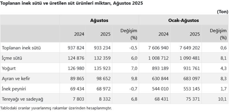 Türkiye İstatistik Kurumu (TÜİK), Ağustos 2025'te ticari süt işletmelerince 933 bin 234 ton inek sütü toplandığını duyurdu. Ocak-Ağustos döneminde süt toplama yüzde 0,6 artarken, süt ürünleri üretiminde artış gözlendi: Ayran ve kefir yüzde 8,3, yoğurt yüzde 4,3, içme sütü yüzde 8,1, tereyağı ve sadeyağ yüzde 10,1 yükseldi.