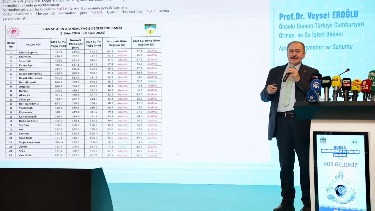 Bursa'da son bir yılda barajlardaki su miktarının yüzde 30 civarında azaldığını vurgulayan Başkan Mustafa Bozbey, bilim insanlarının raporuna göre, 2026 yazının 2025'ten daha sıcak geçeceğini ve bir buçuk derece sıcaklık artışının yaşanacağını söyledi. Bursa'nın artık su şehri olmadığını da vurgulayan Başkan Mustafa Bozbey, 'Suyu asla siyaset malzemesi yapmamalıyız. Tam tersine suyu nasıl koruyacağımızı, gelecek yıllarda nasıl su sorunu yaşamayacağımızı hep birlikte konuşmalıyız. Projeler ortaya koymalıyız. DSİ tarafından Çınarcık Barajı yapılmamış olsaydı, bugün Bursa için daha kötü günleri bekleyebilirdik. Bugün en büyük havzaya sahip olan Çınarcık Barajı'dır. Bu havzalarımızda maden aramayla ilgili herhangi bir işlemin yapılmaması tarafındayız. Çünkü her açılan ocağın suyumuzu kirlettiğinin farkındayız. Hatta suyun ve Bursa'nın geleceği için bu havzada maden faaliyeti yapan kurumların izinlerinin iptal edilmesinin doğru olacağına inanıyoruz' diye konuştu.