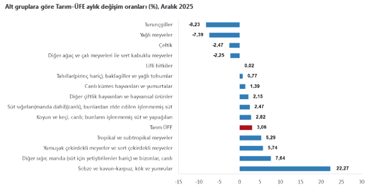 Sektörel bazda değerlendirildiğinde, Aralık ayında tarım ve avcılık ürünleri ile ilgili hizmetlerde yüzde 3,00, ormancılık ürünleri ve ilgili hizmetlerde yüzde 1,59, balık ve diğer balıkçılık ürünleri ile su ürünlerinde ise yüzde 6,25 artış gerçekleşti.