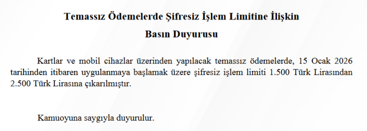 Yapılan açıklamaya göre, kartlar ve mobil cihazlar üzerinden gerçekleştirilen temassız ödemelerde geçerli olan şifresiz işlem limiti, 15 Ocak 2026 tarihi itibarıyla 1.500 TL'den 2.500 TL'ye yükseltileceği duyuruldu.