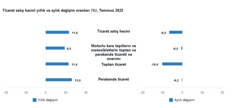 Türkiye İstatistik Kurumu (TÜİK) verilerine göre, Temmuz 2025’te ticaret satış hacmi yıllık bazda yüzde 11,6, perakende satış hacmi ise yüzde 13 yükseldi. Ancak aylık bazda ticaret satış hacmi yüzde 6,5, perakende satış hacmi yüzde 0,2 geriledi.