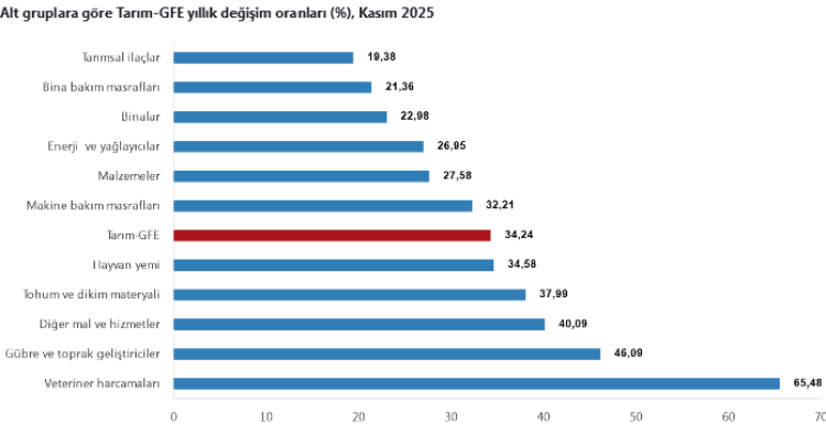 TÜİK'in Kasım ayı verilerine göre Tarımsal Girdi Fiyat Endeksi (Tarım-GFE) aylık yüzde 1,84, yıllık ise yüzde 34,24 artış gösterdi. En yüksek yıllık artış veteriner harcamalarında görüldü. Veriler, tarımsal üretimde maliyet baskısının Kasım ayında da devam ettiğini ortaya koydu.