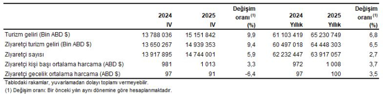 Turizm geliri 2025 yılı IV. çeyreğinde, bir önceki yılın aynı dönemine göre yüzde 9,9 artarak 15 milyar 151 milyon 842 bin dolar olarak gerçekleşti. Bu dönemde ziyaretçilerden elde edilen gelir 14,9 milyar dolar olurken, transfer yolculardan sağlanan gelir 212 milyon dolar oldu. Çeyrek dönem gelirinin yüzde 19,1'i yurt dışı ikametli vatandaşlardan elde edildi.