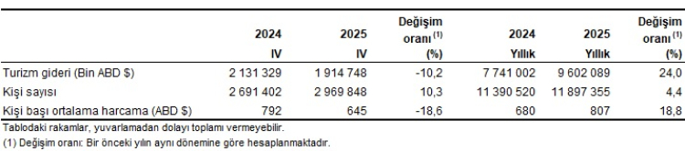 2025 yılı genelinde ziyaretçilerin yüzde 67,7'si Türkiye'ye 'gezi, eğlence, sportif ve kültürel faaliyetler' amacıyla geldi. Yurt dışı ikametli vatandaşlar ise yüzde 63,4 ile en çok 'akraba ve arkadaş ziyareti' amacıyla ülkeyi ziyaret etti. Yurt içinde ikamet edip yurt dışına çıkan vatandaşların harcamalarından oluşan turizm gideri, 2025 yılında yüzde 24 artarak 9 milyar 602 milyon 89 bin dolar oldu. Yurt dışını ziyaret eden vatandaş sayısı ise yüzde 4,4 artışla 11 milyon 897 bin 355 kişiye ulaştı. Kişi başı ortalama harcama 807 dolar olarak gerçekleşti.