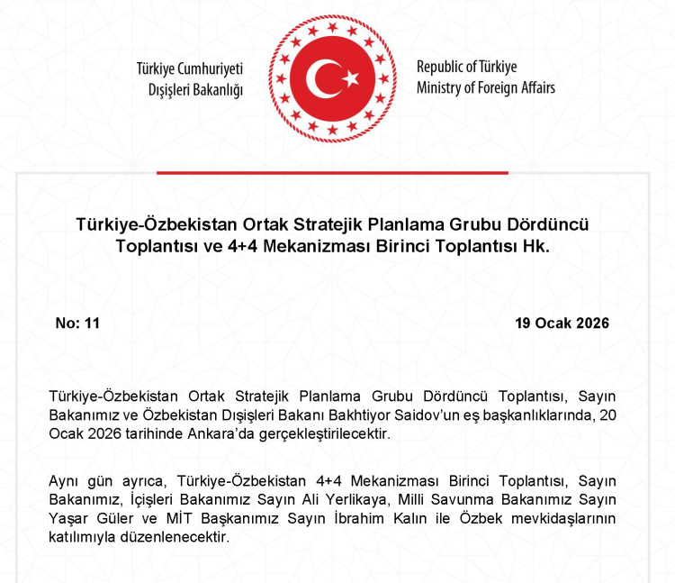 Dışişleri Bakanlığı'ndan yapılan açıklamaya göre, Türkiye-Özbekistan Ortak Stratejik Planlama Grubu Dördüncü Toplantısı, Türkiye Dışişleri Bakanı ile Özbekistan Dışişleri Bakanı Bakhtiyor Saidov'un eş başkanlıklarında yapılacak. Toplantıda iki ülke arasındaki stratejik iş birliği ve ortak projeler masaya yatırılacak.