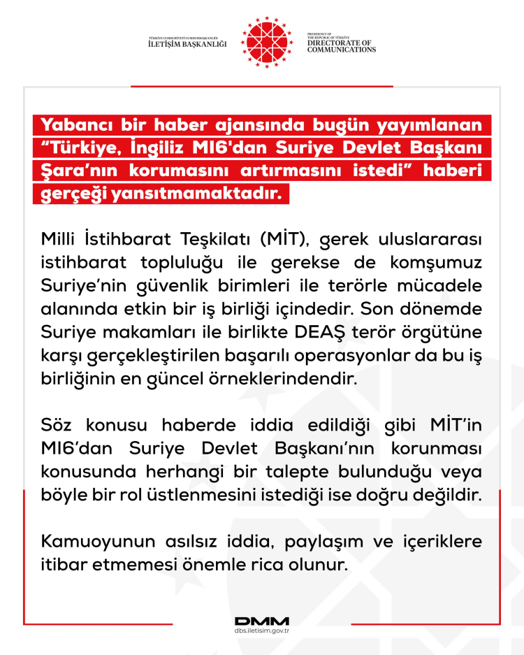 ANKARA (İGFA) - Cumhurbaşkanlığı İletişim Başkanlığı Dezenformasyonla Mücadele Merkezi (DMM), yabancı bir haber ajansında yayımlanan 'Türkiye, İngiliz MI6'dan Suriye Devlet Başkanı Şara'nın korumasını artırmasını istedi' yönündeki iddiaların asılsız olduğunu duyurdu.