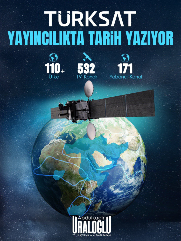 Bakan Uraloğlu, 'Türksat uydularımız sayesinde bugün 110'u aşkın ülkede milyarlarca izleyiciye ulaşıyoruz' dedi. İlk yerli haberleşme uydumuz Türksat 6A'nın sağladığı teknolojik avantaj sayesinde Türkiye'nin dijital yayınlarını yedi kıtaya en yüksek kalitede taşıdıklarını vurguladı.