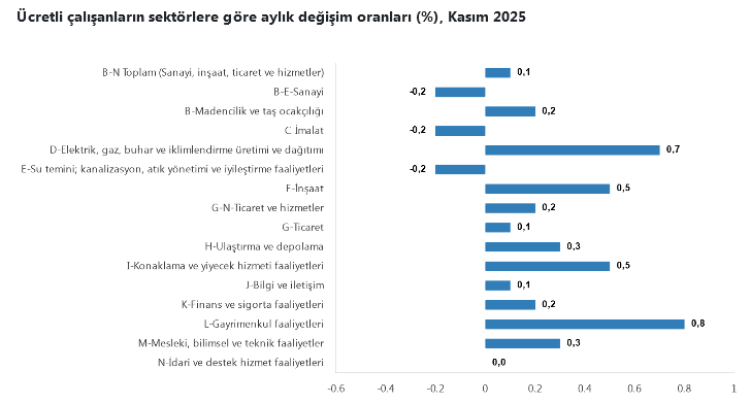 Aylık bazda ise ücretli çalışan sayısı Kasım 2025'te yüzde 0,1 artış gösterdi. Sektörlere göre aylık değişimlerde sanayi sektörü yüzde 0,2 azalış, inşaat sektörü: yüzde 0,5 artış, ticaret-hizmet sektörü yüzde 0,2 artış kaydetti.