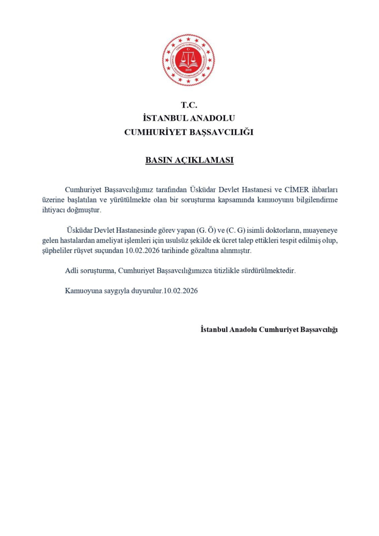İstanbul Anadolu Cumhuriyet Başsavcılığı, Üsküdar Devlet Hastanesi ve CİMER ihbarları üzerine başlatılan soruşturma kapsamında kamuoyunu bilgilendirdi.