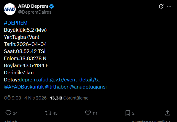 AFAD’dan yapılan açıklamada, “Van ilimizin Tuşba ilçesinde meydana gelen 5,2 büyüklüğündeki deprem sonrası an itibarıyla olumsuz bir durum bulunmamaktadır. Saha tarama çalışmaları devam etmektedir” ifadelerine yer verildi. Yetkililer, ekiplerin bölgede incelemelerini sürdürdüğünü bildirdi.