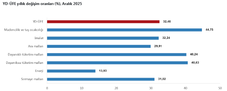 TÜİK verilerine göre, Yurt Dışı Üretici Fiyat Endeksi (YD-ÜFE) imalat ürünlerinde yıllık yüzde 32,24, aylık yüzde 1,84 artış gösterdi. Veriler, yurt dışına yönelik üretimde fiyat artışlarının özellikle tüketim ve sermaye mallarında etkisini sürdürdüğünü ortaya koydu.